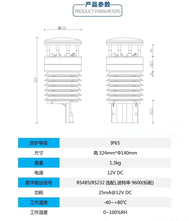 PC-8D型氣象五參數環境監測儀是我公司自主研制的一種測量多要素氣象要素的傳感器,可同時測量大氣溫度、大氣濕度、風速、風向、氣壓等五種主要氣象要素。其特點是精度高,響應時間快,串口輸出,方便用戶直接通過PC或外接儀器進行測量。