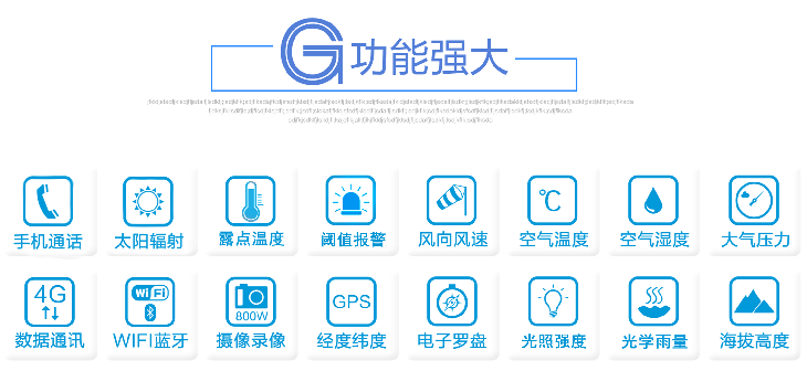 ●功能強大超越了目前所有的手持產(chǎn)品:測量要素為:風(fēng)速,風(fēng)向,氣壓,環(huán)境溫度,環(huán)境濕度,太陽輻射,露點,海拔高度,經(jīng)緯度,GPS衛(wèi)星定位,電子羅盤,,照拍/錄像 , 手機通話功能 , GPRS無線數(shù)據(jù)網(wǎng)絡(luò),還可以拓展CO、NO2、SO2、O3、TVOC、PM2.5、PM10等監(jiān)測要素。
